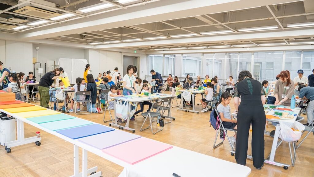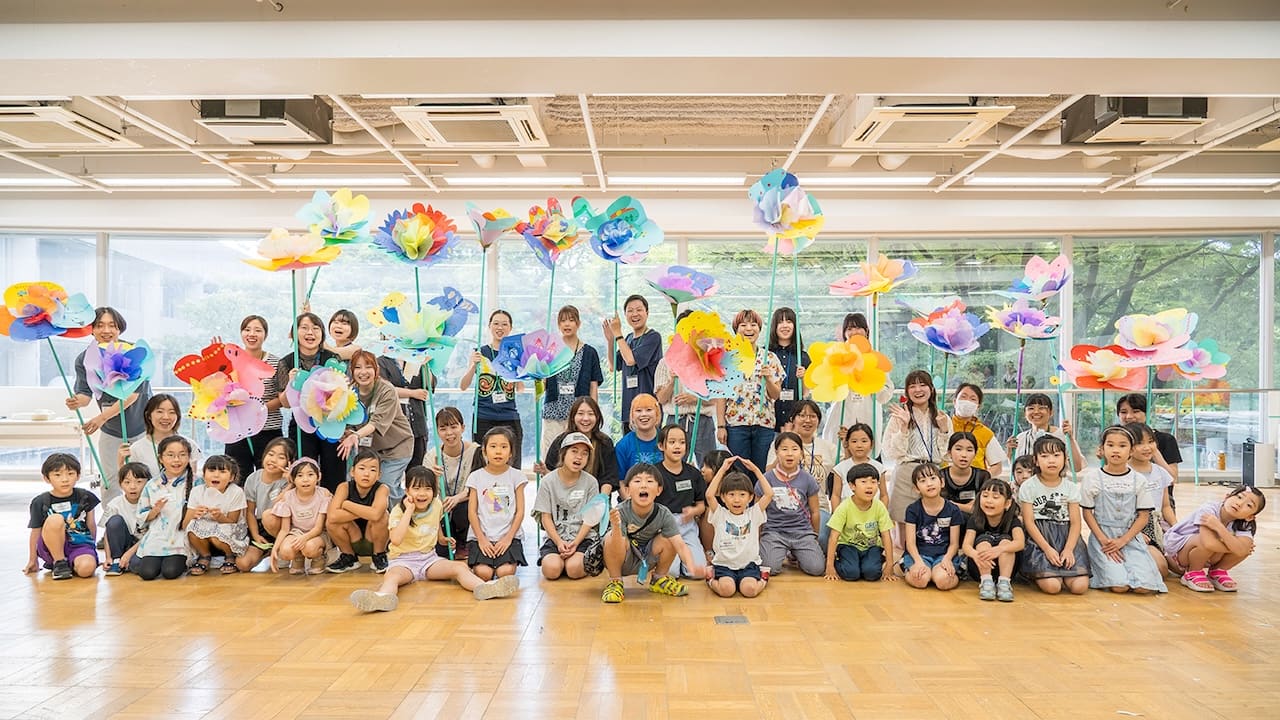 「自分だけの大きな花を作ろう!」では、集まった子どもたちと藝大生が一緒に大きな色画用紙を自由に切り、絵を描いて装飾し、組み立て身長ほどもある大きな花を制作しました。参加者全員が、それぞれ個性あふれる大きな花を完成させることができました。色選びにこだわる子、ハサミを使った造形に工夫を凝らす子、花びらに描く絵を自分なりのストーリーで考える子など、一人ひとりが「どんな花にしたいか」を考え、自らの意志を形にすることができたと感じます。